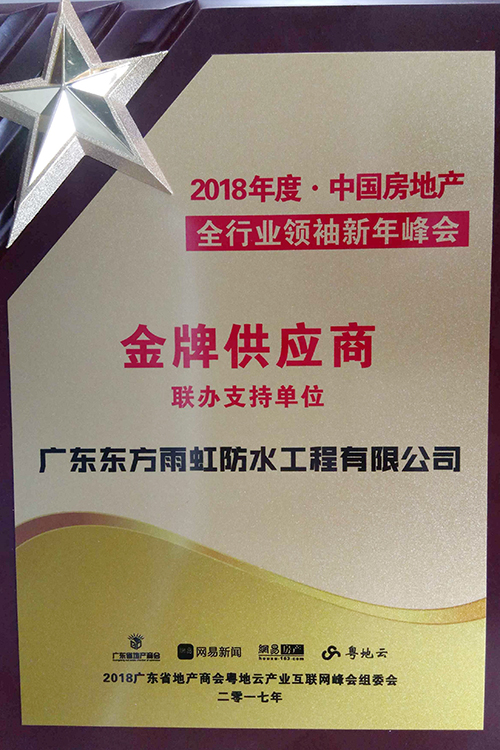 1月12日,由廣東省地產(chǎn)商會(huì)、網(wǎng)易房產(chǎn)聯(lián)合主辦的“2018中國(guó)房地產(chǎn)全行業(yè)領(lǐng)袖新年峰會(huì)暨中國(guó)地產(chǎn)冠軍榜及粵地云產(chǎn)業(yè)互聯(lián)網(wǎng)峰會(huì)”在廣州南豐朗豪酒店隆重舉行,約500多名政府部門人員、行業(yè)高層等出席本次會(huì)議,廣東東方雨虹總經(jīng)理孫福琴應(yīng)邀出席。廣東東方雨虹防水工程有限公司榮獲2018年度·中國(guó)房地產(chǎn)“金牌供應(yīng)商”榮譽(yù)稱號(hào)。