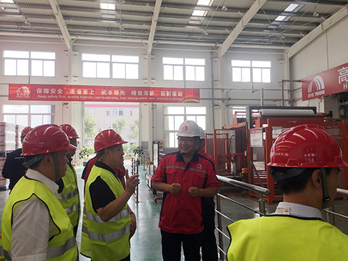 馬到原向考察團介紹了唐山東方雨虹的整體情況、建設規模、企業優勢等,重點講解砂漿車間的生產設備、工藝、產品等情況,并陪同考察團參觀了砂漿車間的德國高效旋轉混合機、八口旋轉包裝機、高位碼垛機等國際先進裝備。