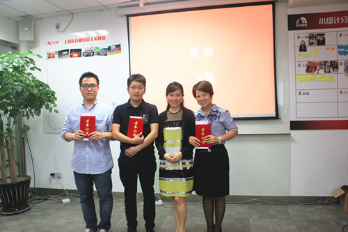 上海公司董事長兼總經(jīng)理李建華為前三名頒獎(jiǎng)(從左至右:王政 林龍飛 李建華 陳林)