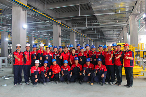 凝結(jié)了建設(shè)開發(fā)團(tuán)隊(duì)、車間全體員工、施工單位232天的辛勤汗水和付出,唐山聚氨酯防水涂料生產(chǎn)線比原定計(jì)劃開機(jī)時(shí)間提前半個(gè)月投產(chǎn)。這條生產(chǎn)線,是東方雨虹第二條聚氨酯防水涂料生產(chǎn)線,擁有29臺(tái)反應(yīng)釜、56臺(tái)儲(chǔ)罐&計(jì)量罐、4365個(gè)閥門、20000余米管線;配備多套獨(dú)立的真空系統(tǒng)、空壓站、冷卻水系統(tǒng)、冷凍水系統(tǒng)、制氮系統(tǒng)、粉料輸送系統(tǒng)和包括機(jī)械手在內(nèi)的6條全自動(dòng)罐裝線,從上桶到尋口,到上蓋、貼標(biāo)、掃碼、碼垛、纏膜全過程自動(dòng)化;熱能綜合利用,節(jié)能且節(jié)約成本;采用高性能SIEMENS S7-400CPU、18IO從站、2368點(diǎn)DI、1152點(diǎn)DO、424點(diǎn)AI、120點(diǎn)AO、多達(dá)19稱重系統(tǒng),70臺(tái)變頻電機(jī)驅(qū)動(dòng)及大量普通驅(qū)動(dòng)電機(jī);全方位控制溫度、液位、重量、壓力、真空、流量,通過十幾套順控流程精準(zhǔn)控制各產(chǎn)品線的生產(chǎn)工藝流程;而整條生產(chǎn)線的控制,僅需要12名工人。
