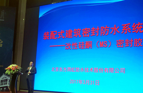 會上,朱衛如作“裝配式建筑密封膠防水系統解決方案”主題報告,從裝配式建筑密封防水系統的開發背景和產品研制來源入手,針對裝配式建筑防水提供系統解決方案;詳細介紹了東方雨虹改性硅酮密封膠系列產品的產品性能、優勢和施工工藝,其中包括建筑石材專用改性硅酮密封膠、PC建筑專用改性硅酮密封膠、門窗專用改性硅酮密封膠和防霉專用改性硅酮密封膠,這四款產品貼合裝配式建筑的特點,系統滿足了裝配式建筑密封防水的功能需求,尤其適用于裝配式建筑工程。