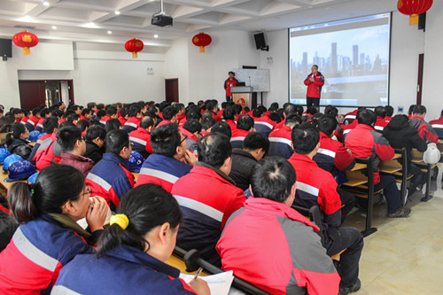 早上七點,唐山生產基地廠長馬到原在辦公樓前迎接所有員工,給大家拜年并發放開年紅包。八點,全體員工集合,進行農歷新年第一次升旗儀式,由馬到原和各部門主管級以上人員簽訂2017年度安全責任狀,組織全體員工進行安全宣誓,隨后,全體人員進行了2個小時的安全培訓。