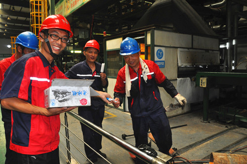 炎炎盛夏,熱浪滾滾,連日來(lái),徐州市氣溫節(jié)節(jié)攀升,最熱時(shí)氣溫高達(dá)38度,驕陽(yáng)似火,酷暑難耐。但東方雨虹的一線員工們依然堅(jiān)守在崗位上,用他們的汗水確保公司的生產(chǎn)活動(dòng)順利進(jìn)行。 7月26日、27日,東方雨虹徐州生產(chǎn)基地組織辦公室所有員工帶著公司的關(guān)懷,來(lái)到車(chē)間,給一線員工們送去了清涼解暑的綠豆湯、冰棍和冰鎮(zhèn)西瓜。雖然汗水已經(jīng)把大家的衣衫浸透,但炎炎夏日擋不住彼此的關(guān)愛(ài)和笑容,一次次傳遞,一聲聲辛苦,在送去涼爽的同時(shí),也溫暖了員工們的心。