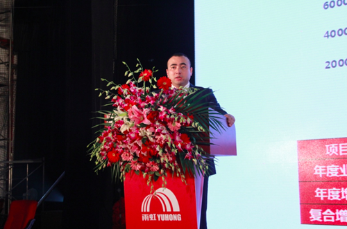 在激昂的司歌合唱后,東方雨虹民用建材公司總經理熊俊上臺致辭,他表示,2015年是雨虹防水的收獲年,無論是市場增長,各片區發展,還是公司運營,人才培養,都取得了卓有成效的發展。在肯定2015年工作成績的同時,也指出了公司在渠道,店面等方面的工作還存在很多問題。未來,東方雨虹要堅持用調研數據做為戰略決定的基礎,堅持店面開發,專業人士拓展,強化同家裝公司合作,及O2O線上線下一體化。他還提出,2016年是非常關鍵的一年,新起點、新征程既是對我們空杯歸零的期許,也是開拓民建嶄新未來的背水一戰。