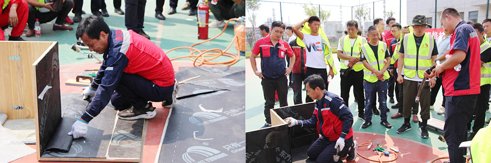 雨虹學院高級培訓師張廣輝、2019“聯盟杯”全國建筑防水行業職業技能大賽-防水涂料項目冠軍洪存峰等為合伙人現場演示瀝青防水卷材、高分子防水卷材、防水涂料等產品的標準化施工工藝。