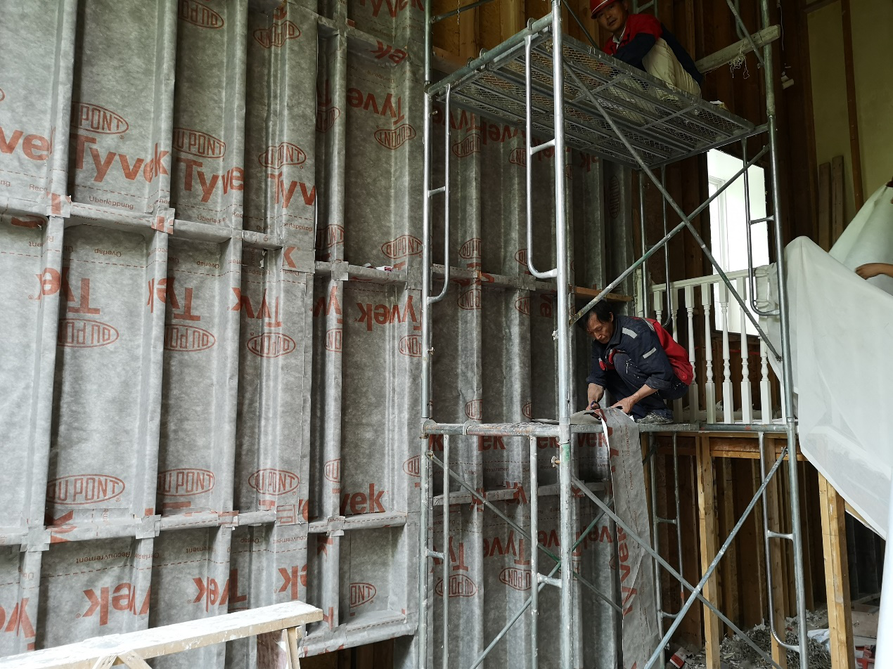 特衛強®防水透汽膜可防止外部雨、雪、昆蟲等對建筑的侵蝕,杜絕了濕氣的來源,另外其獨特的透水蒸氣性能,又能讓建筑墻體中的濕氣排出,避免潮氣在建筑墻體中的滯留。防水透汽膜一般用于建筑墻體靠外一側,本項目翻新時先做防水透汽膜的施工,施工工藝為空鋪,由墻角從下往上施工,采用木工釘或氣釘間隔300~600mm加以固定,并配合配套膠帶對拼接縫進行密封,干作業施工便捷,縮短維修工期。在建筑翻新過程中無需拆除建筑外墻裝飾,室內作業不受環境影響,施工干擾性小。