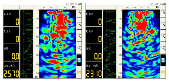 為尋找造成地下防水工程滲漏的原因,以更好地控制防水工程質量,雨虹修繕引進超聲波斷面成像儀,可用于混凝土結構中的外部侵入物、缺陷、裂縫以及管道及蜂窩等缺陷的無損檢測。如果混凝土內部的缺陷足夠大,激發的超聲波會被該缺陷提前發反射,因為反射線路徑更短,由缺陷反射的信號會早于混凝土底面反射的信號到達接收端。信號處理軟件依據每排換能器接收到的反射脈沖的到達時間,來推斷混凝土內部缺陷的位置,最大可探查1.8m。