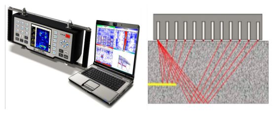 如果構件內部的混凝土-空氣界面(缺陷)足夠大,一部分激發的應力脈沖會被該缺陷提前發射。如右圖所示,因為射線路徑更短,由缺陷反射的信號會早于構件底面反射的信號到達接收端。信號處理軟件依據每排換能器接收到的反射脈沖的到達時間,來推斷構件內部缺陷的位置。