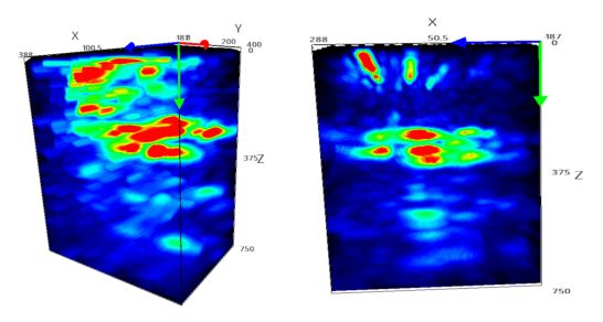 三維立體掃描,側墻部位其內部孔隙率非常多,多集中在表層以及200mm到300mm之間區域,且存在貫穿性裂縫。