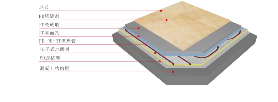 孚達高強度干式地暖模塊壓縮強度達到1200kPa以上,整體系統省掉12mm的水泥承壓板,從而最大程度的節約構造層厚度,是新一代干式地暖系統。